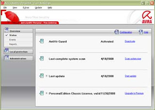 For those of you may already be familiar with this AntiVirus, Avira Antivir PersonalEdition Classic. As well as AVG, Avira also offers free antivirus. With the installation files that only around 17 MB (less than AVG Free Edition which is about 32 MB), this antivirus is pretty good, a lot of positive response from many users. Relative scan detects more viruses than AVG or other anti-virus, even though not a few reports on the error detect the virus, so we must always be ready to decide whether the virus detected or not. But it makes Antivir better able to detect the latest virus variants. Setting about that later can be adjusted, in the Configuration menu.